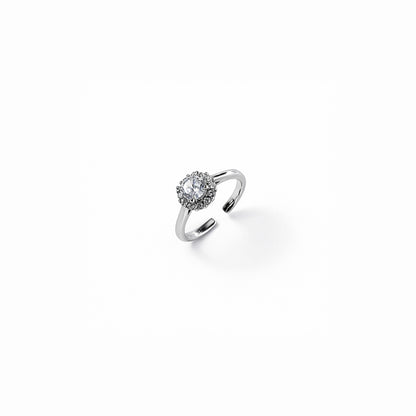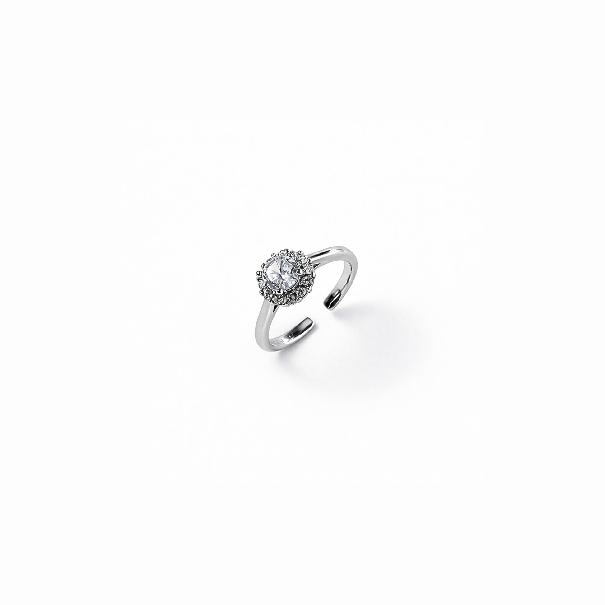 Un anello essenziale e luminoso, con una fila di zirconi che abbraccia il centro come un gesto silenzioso: deciso, delicato, autentico.