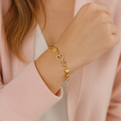 Romantico, luminoso, senza tempo. Amouré è il bracciale che celebra l’amore in tutte le sue sfumature. Una catena di cuori in acciaio inox con un cuore centrale impreziosito da zirconi brillanti: un design femminile e chic, perfetto per completare ogni look.