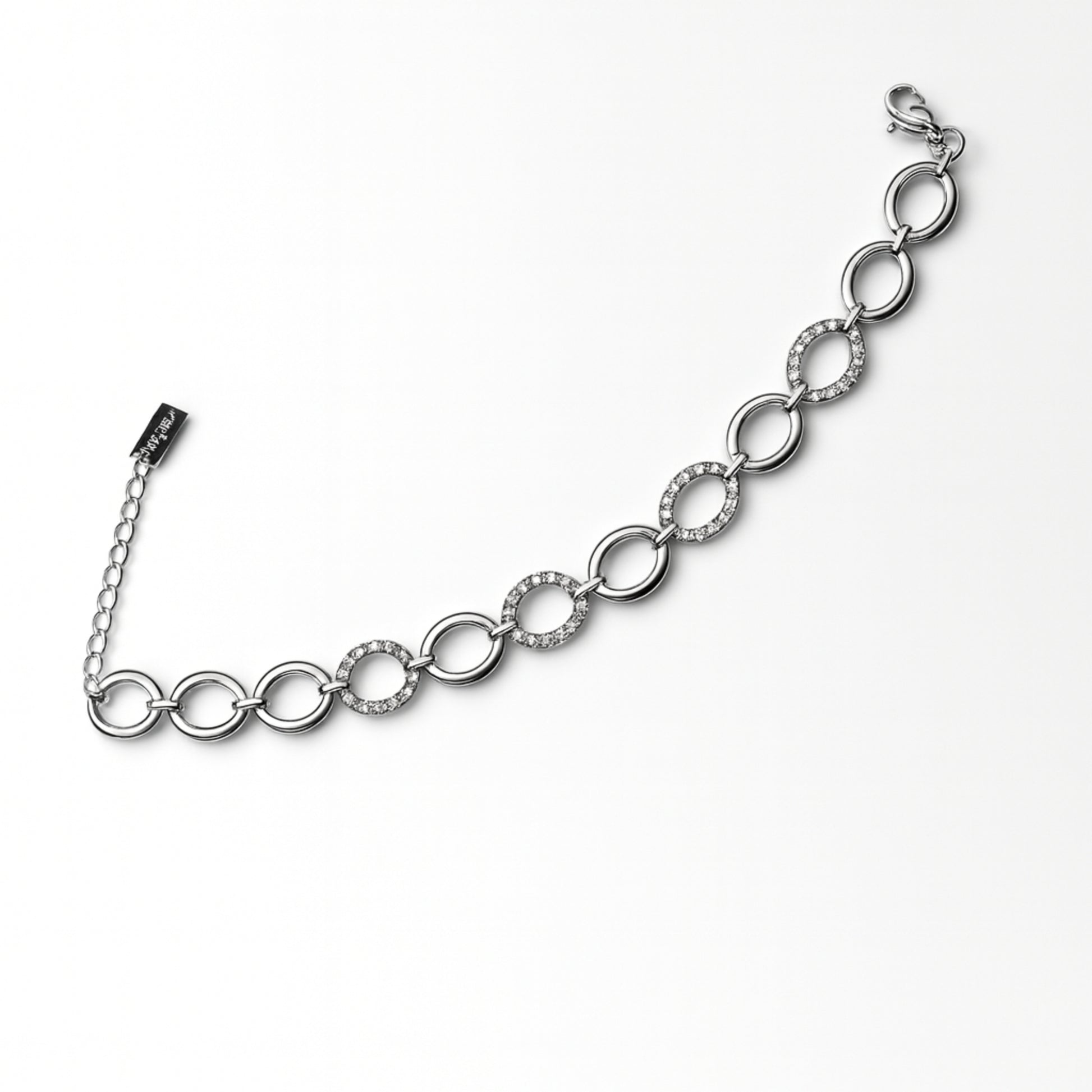 Design contemporaneo, linee senza fine. Loop è il bracciale in acciaio inox con maglie circolari alternate: alcune lisce, altre impreziosite da zirconi brillanti. Un gioiello moderno e sofisticato, pensato per chi ama l’equilibrio tra minimalismo e luce.