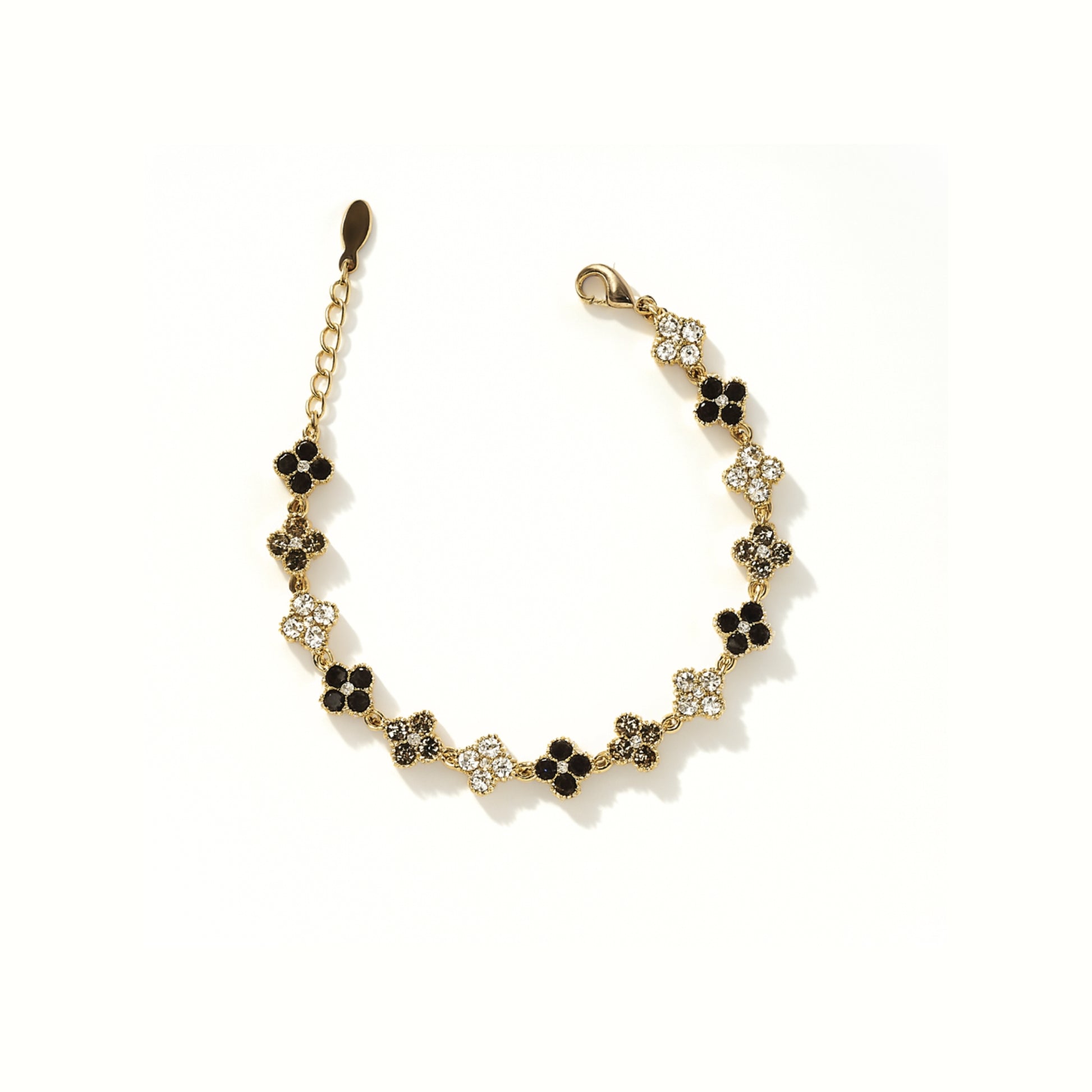 Fiori delicati, tocchi neri e un bagliore dorato che si muove con te — dolce, ma con carattere.