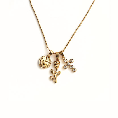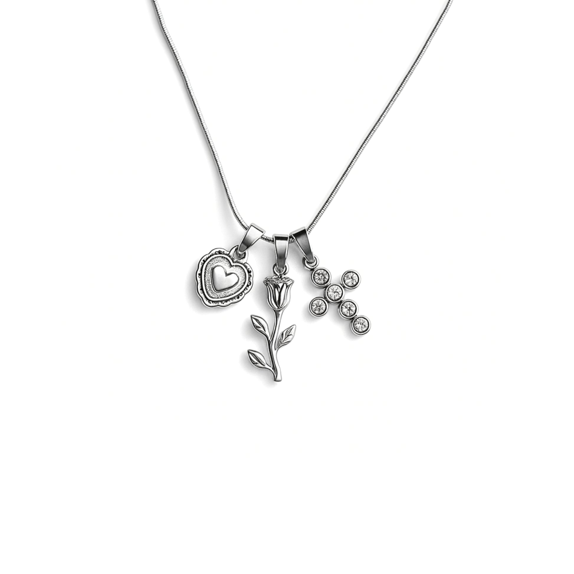 - 💖 Ciondoli: cuore inciso, fiore delicato e croce brillante.