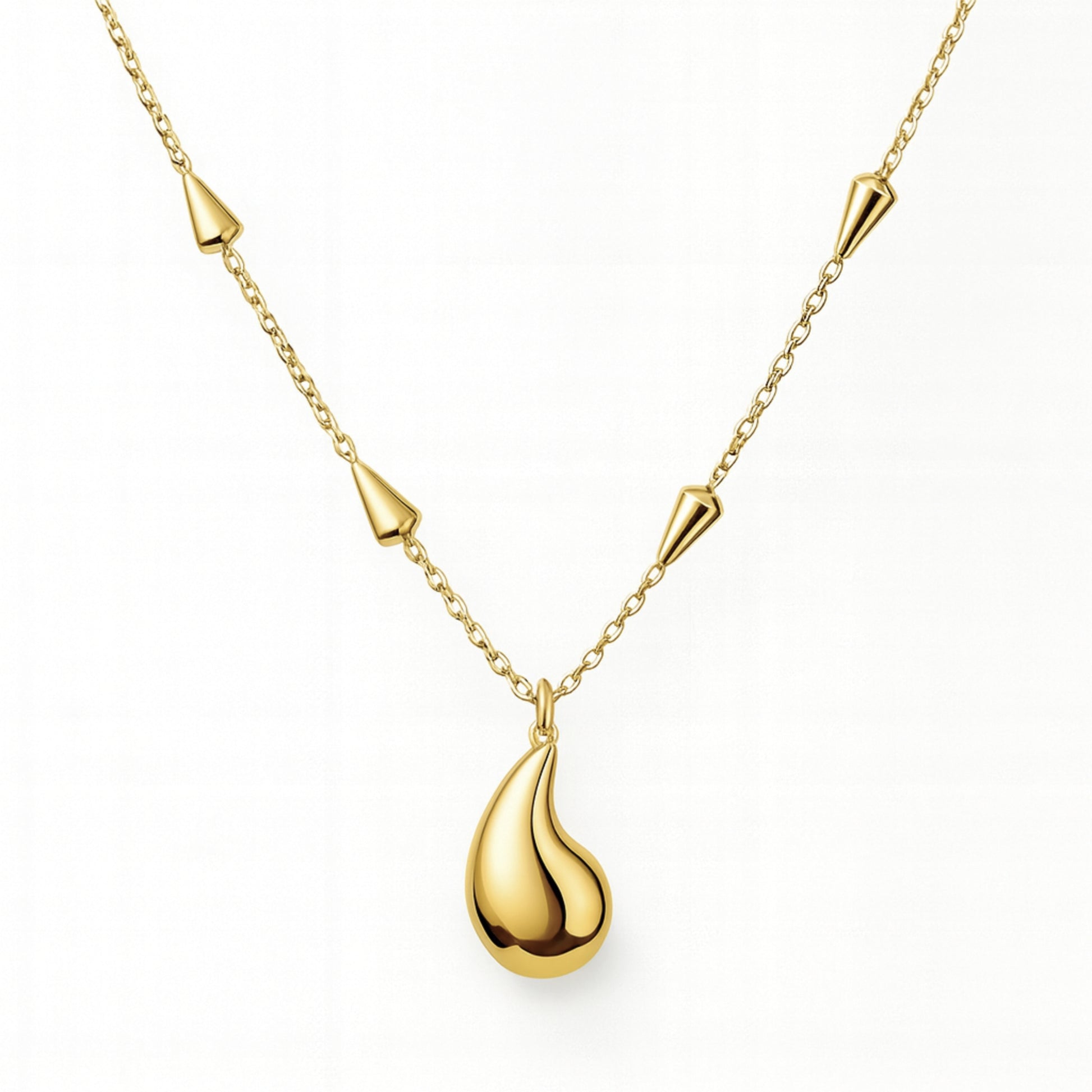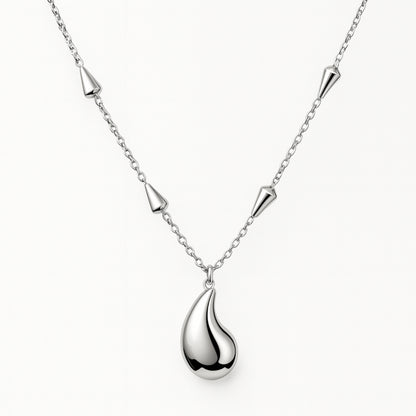 Realizzata in acciaio inox, presenta un ciondolo a goccia dal look fluido e metallico, accompagnato da elementi conici che decorano la catena in modo geometrico ed elegante.