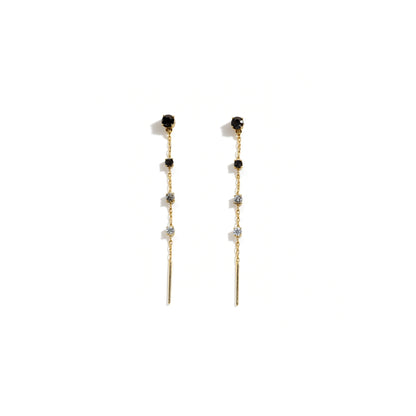 Realizzati in acciaio inox dorato, questi orecchini lunghi sono impreziositi da una sequenza di zirconi tricolore che creano un contrasto sofisticato e magnetico.