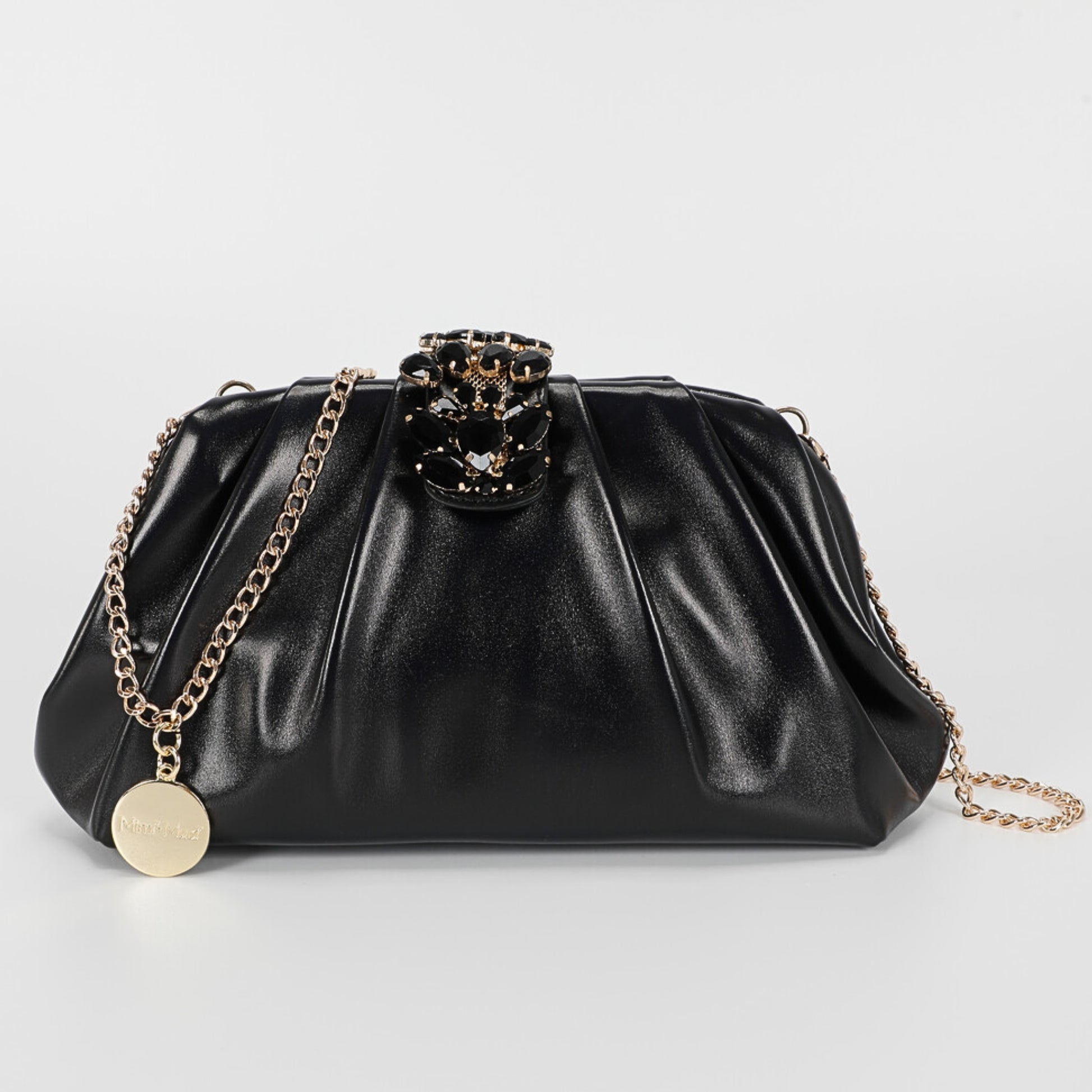 Il nero profondo incontra una chiusura gioiello di cristalli scuri, creando un pezzo magnetico che accompagna qualsiasi look con carattere e raffinatezza.