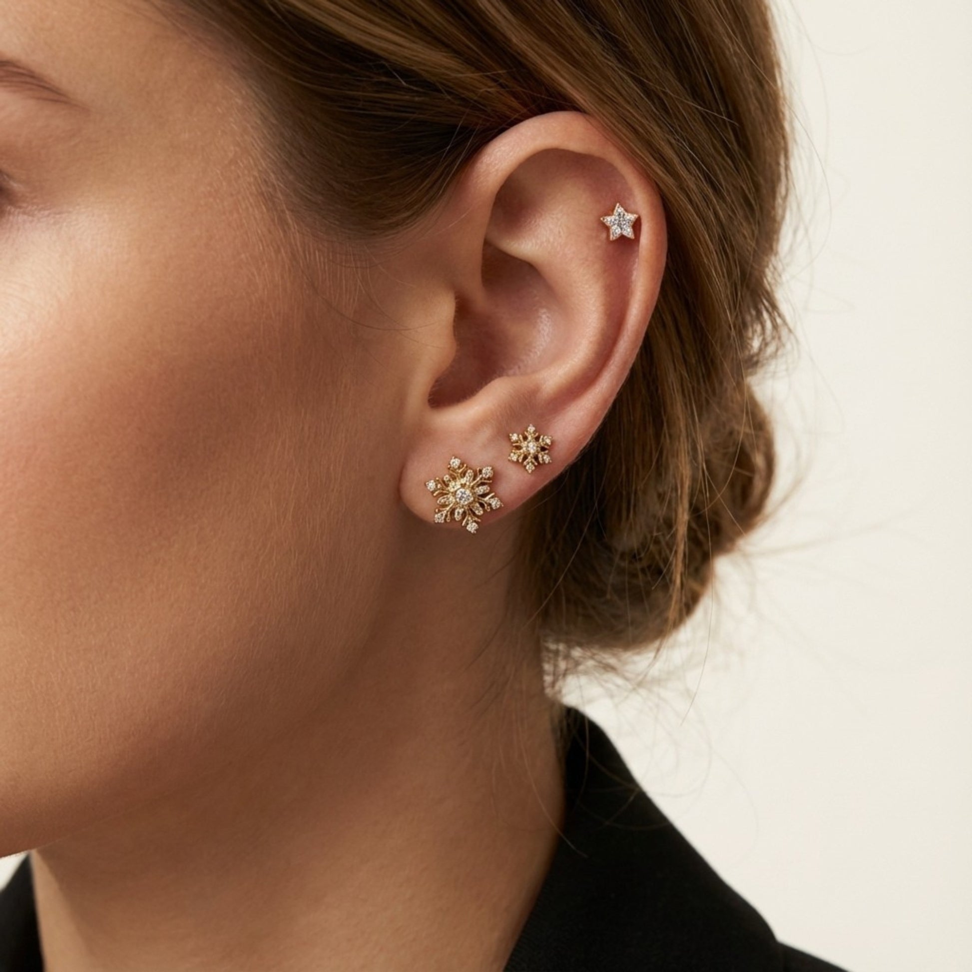 Winter Set riunisce due fiocchi di neve — uno più definito, uno più compatto — e una piccola stella brillante. Insieme creano un gioco di simmetrie morbide che illumina il viso senza eccessi.